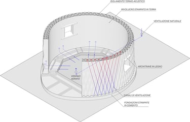 La struttura è stata interamente realizzata con la stampante Crane WASP, che ha depositato strati successivi di una miscela di terra, paglia, lolla di riso e calce, dando forma a pareti portanti naturali e traspiranti. La miscela è il cuore del progetto: un materiale ottenuto interamente da risorse locali e rinnovabili.