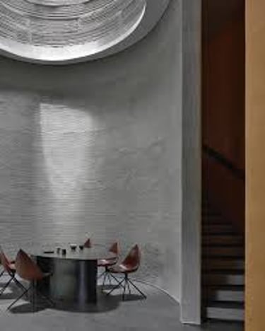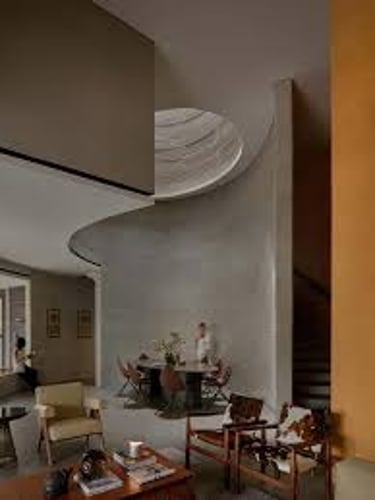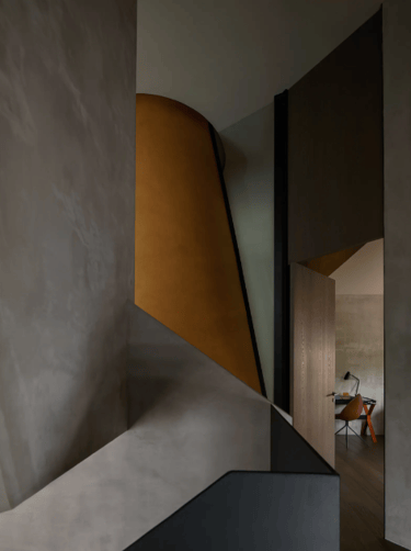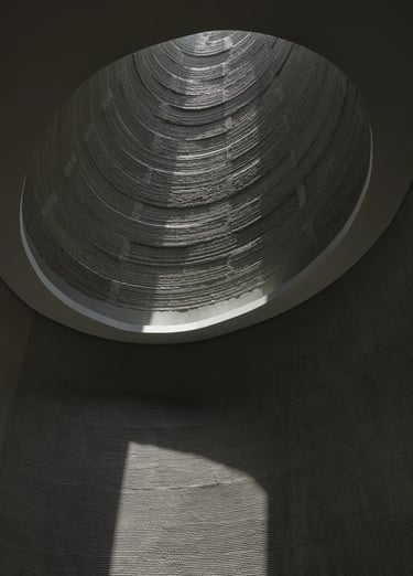 Al centro dell’abitazione, come un vero gesto architettonico, si apre un grande oculo conico che attraversa verticalmente tutti i piani. Questo vuoto, scolpito dalla tecnologia ma carico di una luce quasi naturale, diventa il cuore della casa: un pozzo luminoso che porta il cielo dentro gli spazi comuni. Non è soltanto un elemento estetico perche favorisce la ventilazione naturale, convogliando verso l’alto l’aria calda e rinfrescando gli ambienti in modo passivo.
