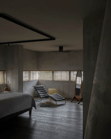 All’interno, il linguaggio cambia ma non si tradisce: superfici più levigate, dettagli in legno naturale, toni neutri, materiali tattili come pelle, tessuti grezzi e inserti vintage mitigano la potenza del cemento. L’insieme genera un’atmosfera calda, essenziale, quasi meditativa. È una casa che si percepisce viva ma calibrata, tecnologica ma accogliente, scultorea ma abitabile.